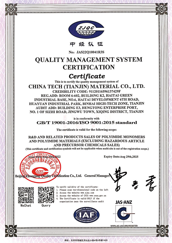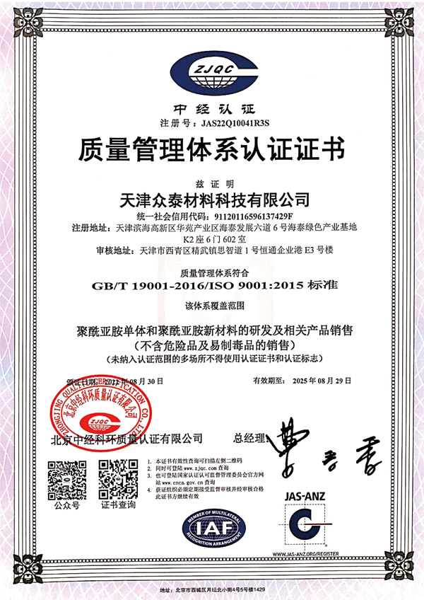 天津眾泰材料科技有限公司(以下簡(jiǎn)稱“眾泰”),是一家“以先進(jìn)功能性聚酰亞胺單體研發(fā)生產(chǎn)為核心,致力于推動(dòng)全球聚酰亞胺材料產(chǎn)業(yè)發(fā)展”為使命的創(chuàng)新型高新技術(shù)企業(yè)。眾泰研制的聚酰亞胺單體目前已廣泛應(yīng)用于無(wú)色透明柔性聚酰亞胺薄膜、柔性顯示材料、5G新材料等諸多高科技領(lǐng)域產(chǎn)品的生產(chǎn)。
